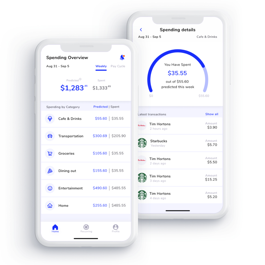 Home page helps users get a bird's eye view of their spending on a weekly and monthly basis by showing how they are doing in the header and how much they've spend on each particular category at the bottom.